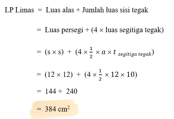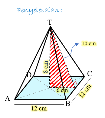 Alas limas T.ABCD pada gambar di samping berbentuk persegi dengan panjang sisi 12 cm dan tinggi limas 8 cm. Hitunglah luas permukaan limas!