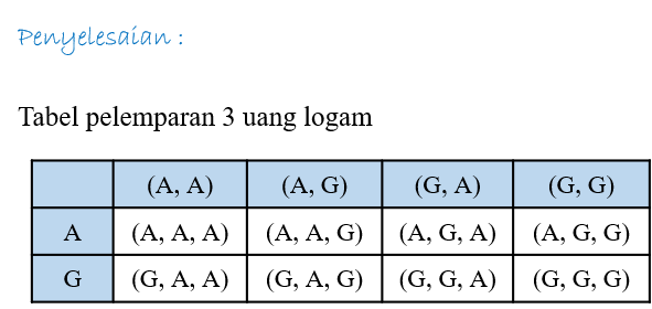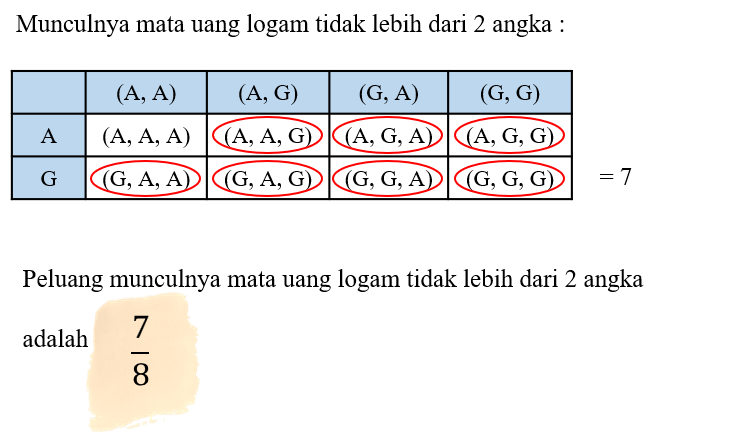 Pada sebuah percobaan pelemparan tiga uang logam, hitunglah peluang munculnya mata uang logam tidak lebih dari 2 angka!