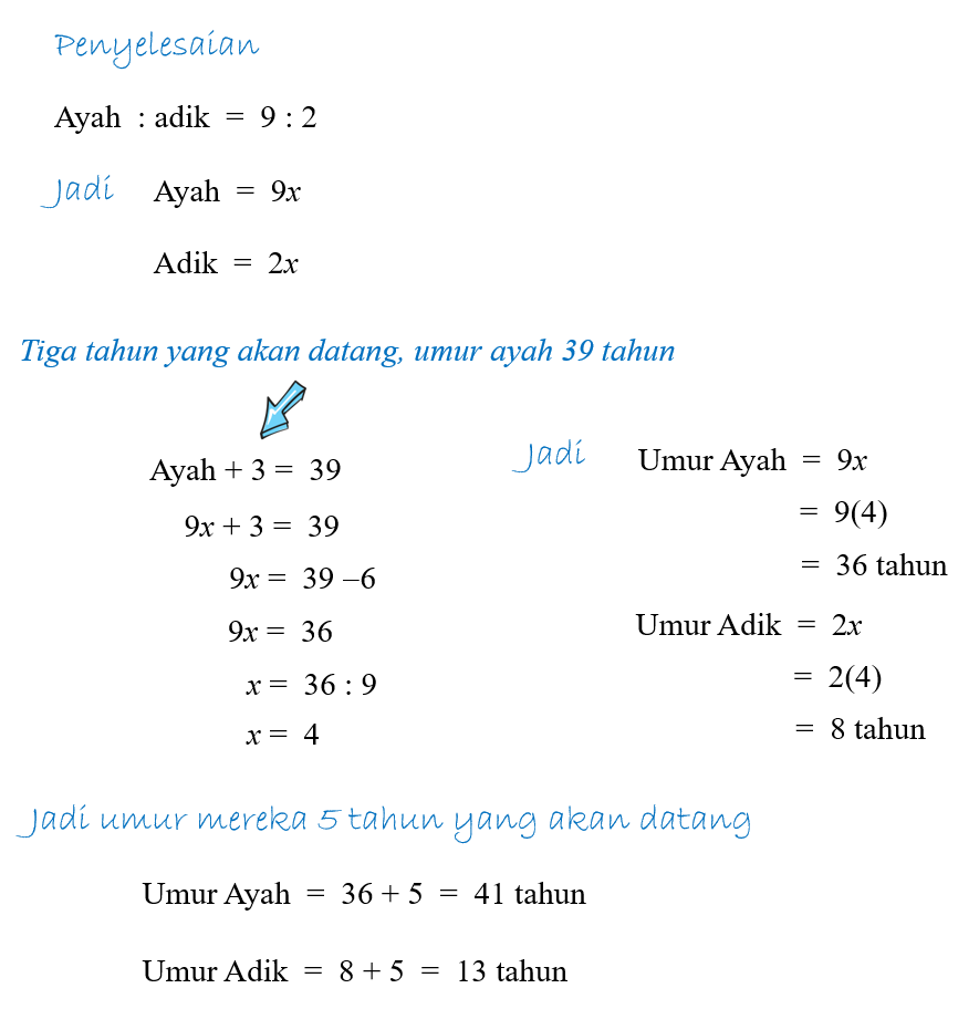 Perbandingan umur ayah dan adik adalah 9 : 2. Tiga tahun yang akan datang, umur ayah 39 tahun. Tentukan umur mereka 5 tahun yang akan datang!