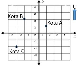 C. Kota C 4 km sebelah utara 3 km sebelah timur kota A dan 1 km sebelah utara 4 km sebelah timur kota B.