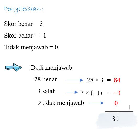 Dalam kompetisi matematika, setiap jawaban benar diberi skor 3, jawaban salah diberi skor -1, dan tidak menjawab diberi skor 0. Dari 40 soal yang disediakan, Dedi menjawab 31 soal, yang 28 soal diantaranya benar, tentukan skor yang diperoleh Dedi!