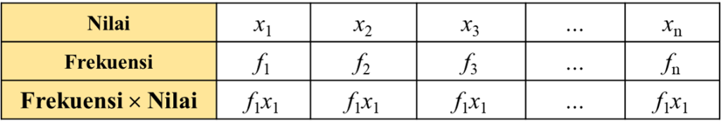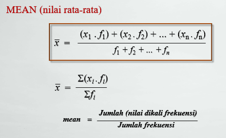 Untuk menentukan nilai mean dari data yang berupa tabel frekuensi kalian bisa menghitung dengan menggunakan rumus :