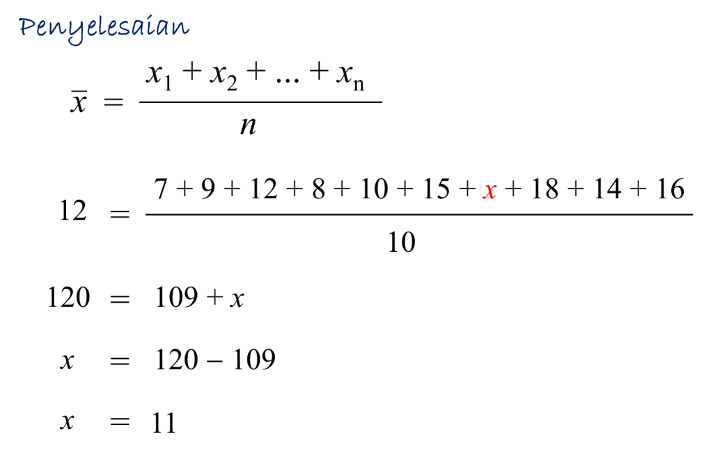 Mean dari data : 7, 9, 12, 8, 10, 15, x, 18, 14, dan 16 adalah 12.