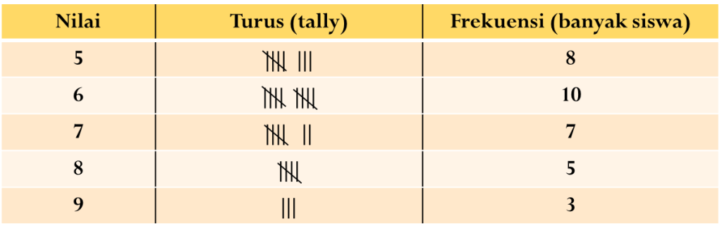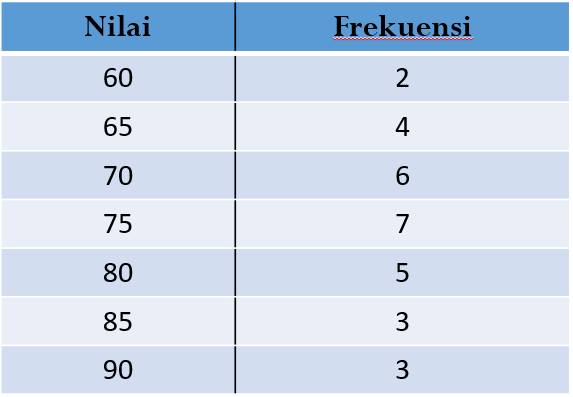 Untuk mencari nilai terendah, nilai tertinggi, banyak siswa yang memperoleh nilai di atas 7, dan lain-lain dari data tersebut maka data dapat disajikan dalam bentuk tabel distribusi frekuensi.