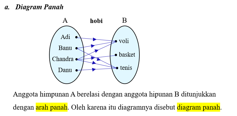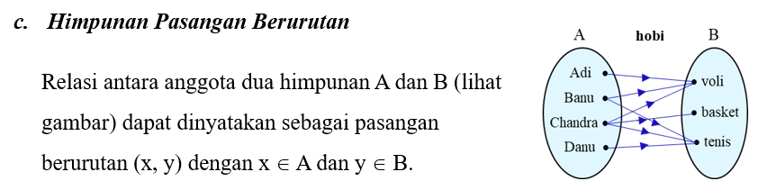 Pada relasi yang ditunjukkan dengan diagram panah pada gambar dapat dinyatakan sebagai himpunan pasangan berurutan, yaitu {(Adi, voli), (Banu, voli), (Banu, tenis), (Chandra, voli), (Chandra, basket), (Chandra, tenis), (Danu, tenis)}.