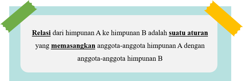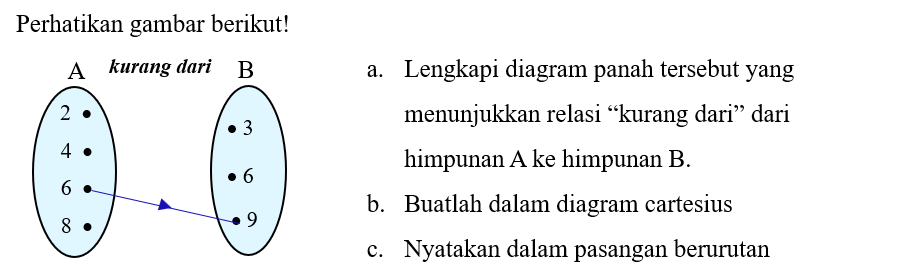 b.Relasi apakah yang menyatakan hubungan antara himpunan A dan himpunan B di atas?