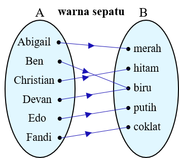 Jika A = {Abigail, Ben, Christian, Devan, Edo, Fandi} dan B = {merah, hitam, biru, putih, coklat}, maka dapat dibentuk relasi (hubungan) antara anggota-anggota A dan anggota-anggota B. Relasi tersebut ditunjukkan dengan gambar: