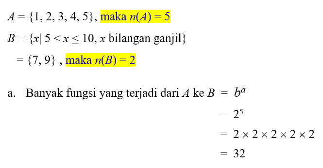 Jika A = {1, 2, 3, 4, 5} ke B = {x| 5 < x < 10, x bilangan ganjil}, tentukan banyak semua fungsi yang terjadi berikut ini!