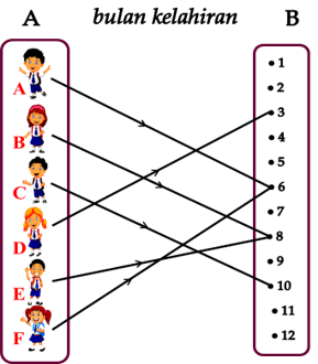 Pada relasi dari himpunan A dan B tersebut diperoleh setiap anak pada himpunan A mempunyai satu bulan kelahiran pada himpunan B. Maka dapat dikatakan: