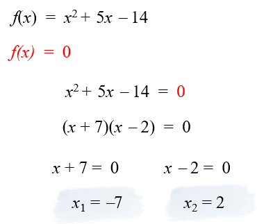 Jadi, jika f(x) = 0 terdapat dua nilai x, yaitu x1 = -7 dan x2 = 2