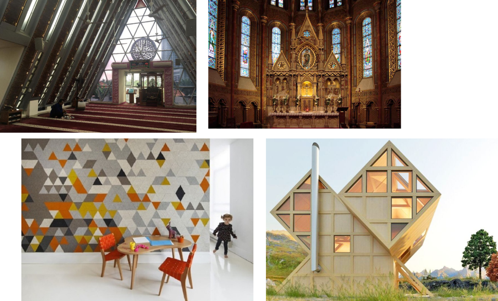 Gambar di atas menunjukkan beberapa bangunan dan desain interior yang menggunakan corak segitiga-segitiga yang kongruen.