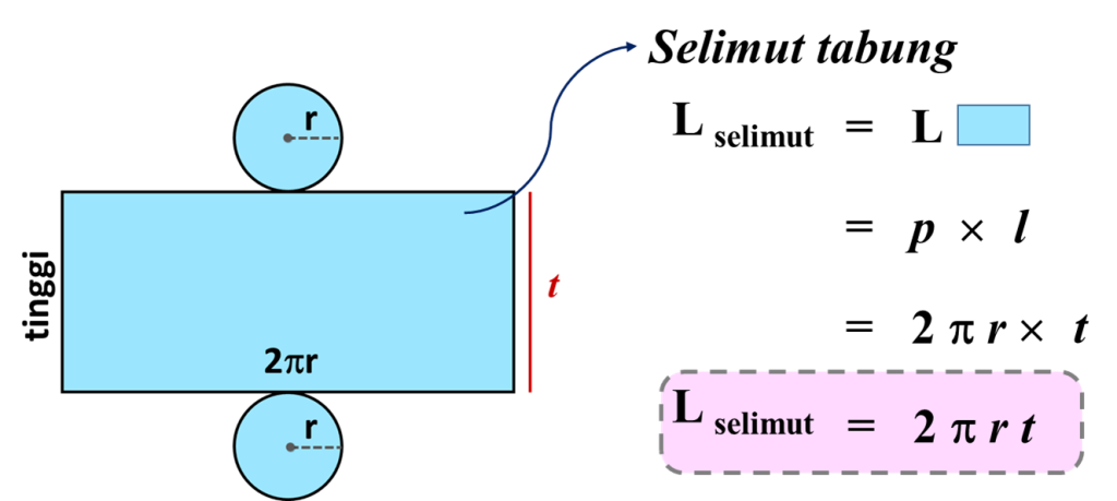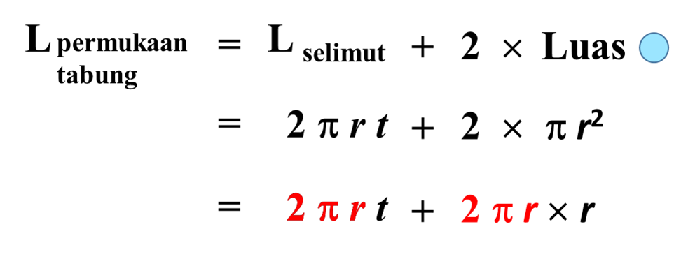 Jika kita melihat jaring-jaring tabung di atas, luas permukaan tabung terdiri dari luas selimut tabung dan 2 kali luas lingkaran alas. Maka dapat ditentukan rumus untuk luas seluruh permukaan tabung, yaitu :