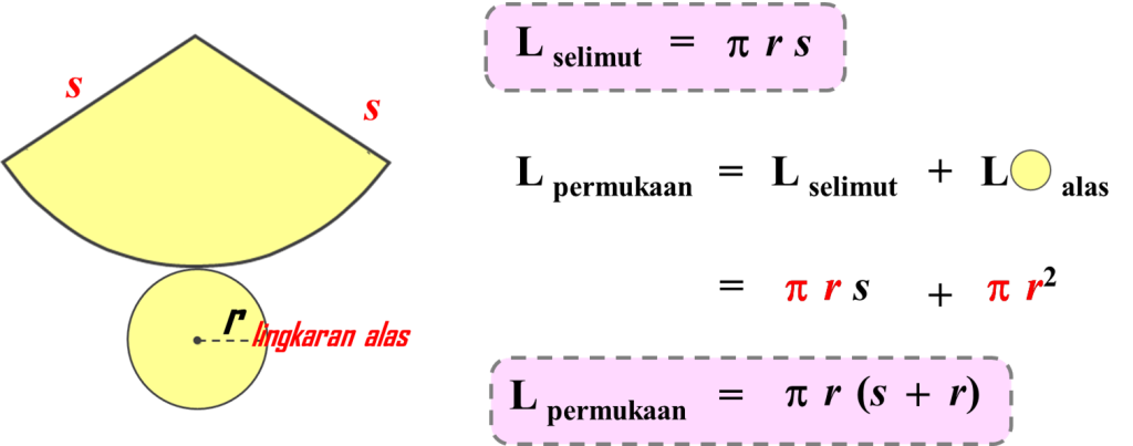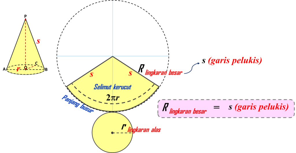 - Panjang busur = 2πr (keliling lingkaran alas)