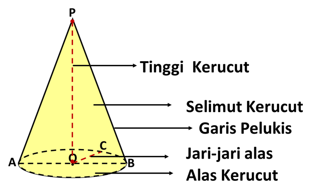 Untuk setiap kerucut dengan jari-jari = r dan tinggi = t, berlaku: