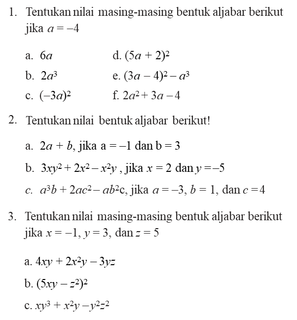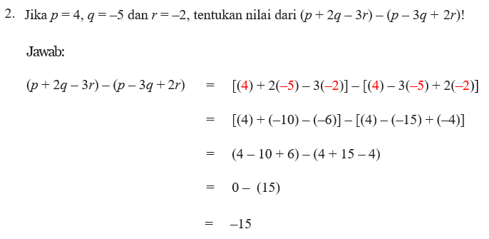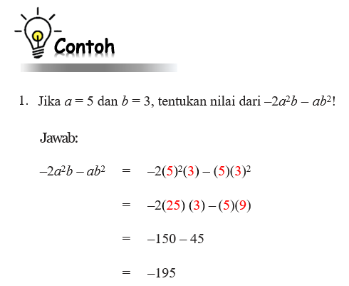 Arti dari substitusi ini adalah menggantikan variabel dengan bilangan yang ditentukan. Kegiatan substitusi ini sering digunakan dalam perhitungan yang menggunakan rumus, baik dalam perhitungan matematika ataupun dalam mata pelajaran lain.