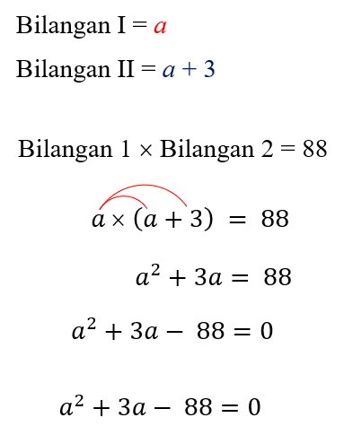 Dua buah bilangan cacah berselisih 3 dan hasil kalinya 88.