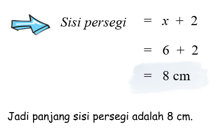 Luas persegi panjang yang berukuran panjang (3x – 2) cm dan lebar (x – 2) cm sama dengan luas persegi dengan panjang sisi (x + 2) cm. Tentukan panjang sisi persegi ini!