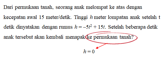 h = -5t2 + 15t. Setelah beberapa detik anak tersebut akan kembali menapak ke permukaan tanah?
