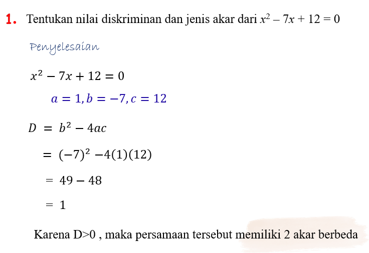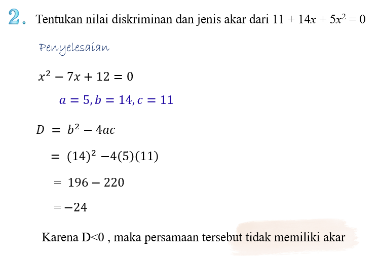 Untuk soal no 1- 3, tentukan nilai diskriminan dan jenis akar pada persamaan-persamaan berikut!
