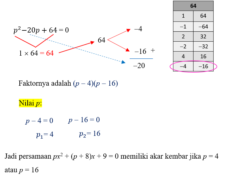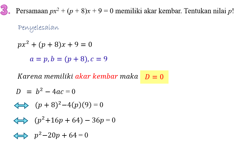 4) Persamaan x2 + 2px – 3 = 0 memiliki nilai diskriminan 48. Tentukan nilai p!
